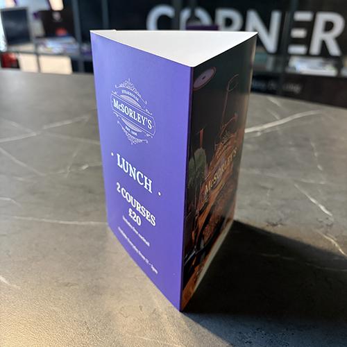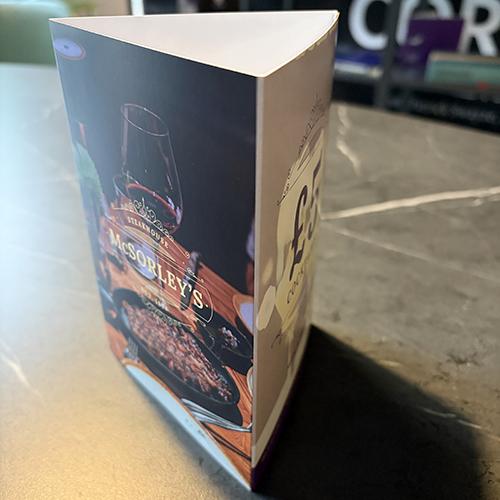 Available in 3 sizes - small (A6), Medium, (1/3rd A4) and Tall (297 x 140mm), all with 3 panels to personalise with your promotion or menu.