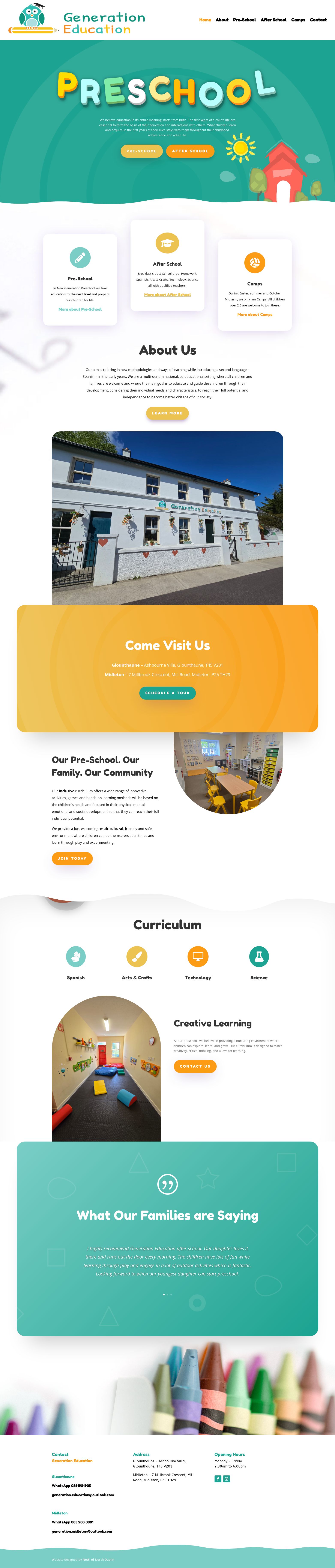 Generation Education preschool’s website provides a welcoming and informative platform for parents, guardians, and prospective students. The site reflects the preschool's nurturing environment and educational philosophy, showcasing diverse programs and dedicated staff. Through vibrant colours, playful typography, and engaging imagery, it creates an inviting atmosphere that mirrors the preschool's focus on fostering curiosity and growth. The website includes detailed descriptions of age-specific programs that balance academic learning with play-based activities. Essential information about the programmes offered and admissions process is also provided, making it a valuable resource for families considering enrolment.