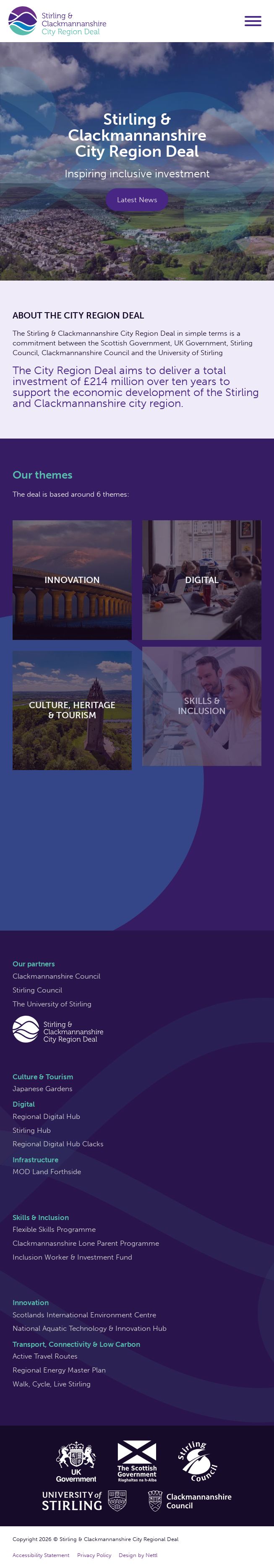 The Stirling & Clackmannanshire City Region Deal website, built on WordPress, is a platform detailing a £214 million, ten-year investment initiative by the Scottish Government, UK Government, Stirling Council, Clackmannanshire Council, and the University of Stirling. The project aims to stimulate economic development in the Stirling and Clackmannanshire city region. The deal revolves around six themes: innovation, digital, culture, heritage & tourism, skills & inclusion, transport, connectivity & low carbon, and infrastructure. The site provides updates on the progress of the deal, information about partners, and specific projects under each theme.