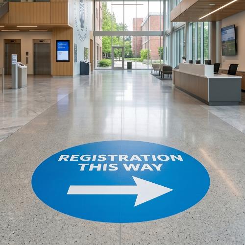 Offices, hospitals, and educational facilities use floor signage for directions, safety instructions, and branded environments that improve clarity and communication.